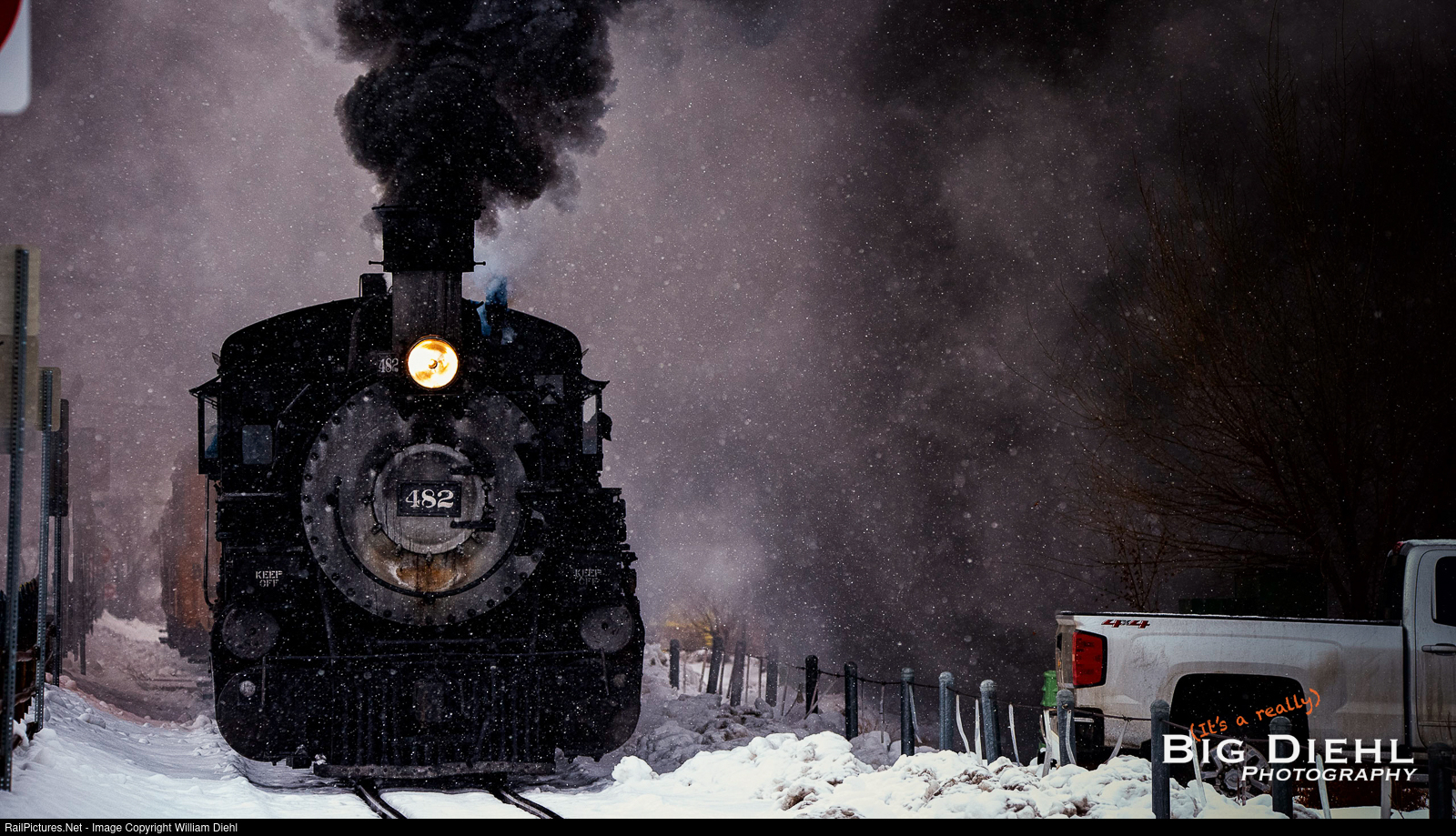 On a cold, snowy morning, Durango And Silverton #482 takes train 261, the Cascade Canyon Express out of downtown Durango during a snow squall. |