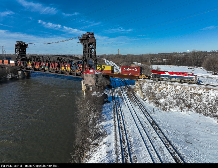 After a wait at East Bridge Junction, the BC Rail heritage unit leads Q116 across the old EJ&E Bridge 198 and the Des Plaines River.