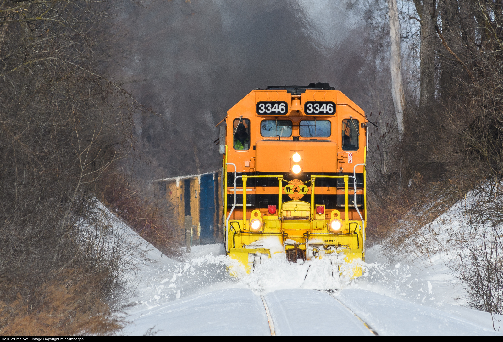 | The Rochester & Southern's RS-1 plows through fresh snow as it rolls south out of Le Roy, New York and passes through a small cut at Cole Road. Exhaust haze fills the air as the quartet of EMD's lead a long train towards Silver Springs. |