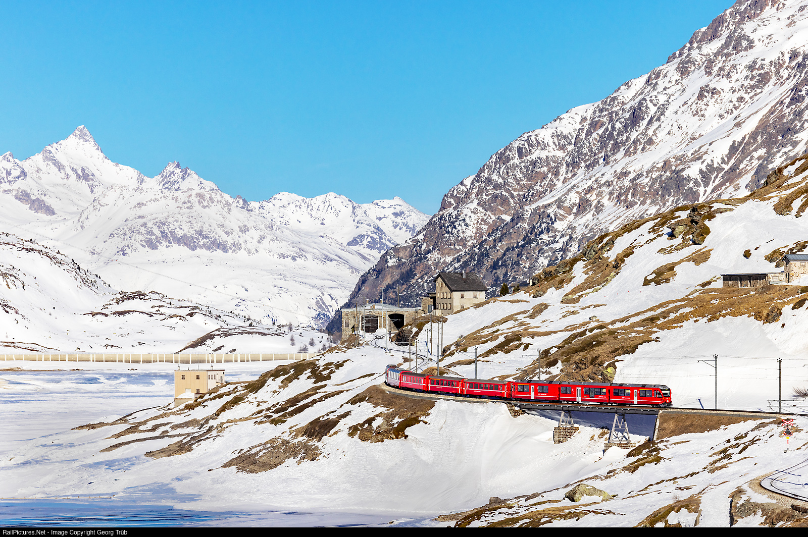 | "Allegra" ABe 8/12 # 3501 of the Rhaetian Railway is pulling regional train 1617 from St.Moritz to Tirano along the frozen Lago Bianco (White Lake) on about 2250 meter a s.l. between Ospizio Bernina and Alp Grüm, crossing the bridge "at the lake", also called "wild west bridge". In the background is 3246 meter high Piz Ot, north of the Engadine, more then 20 kilometer away. |