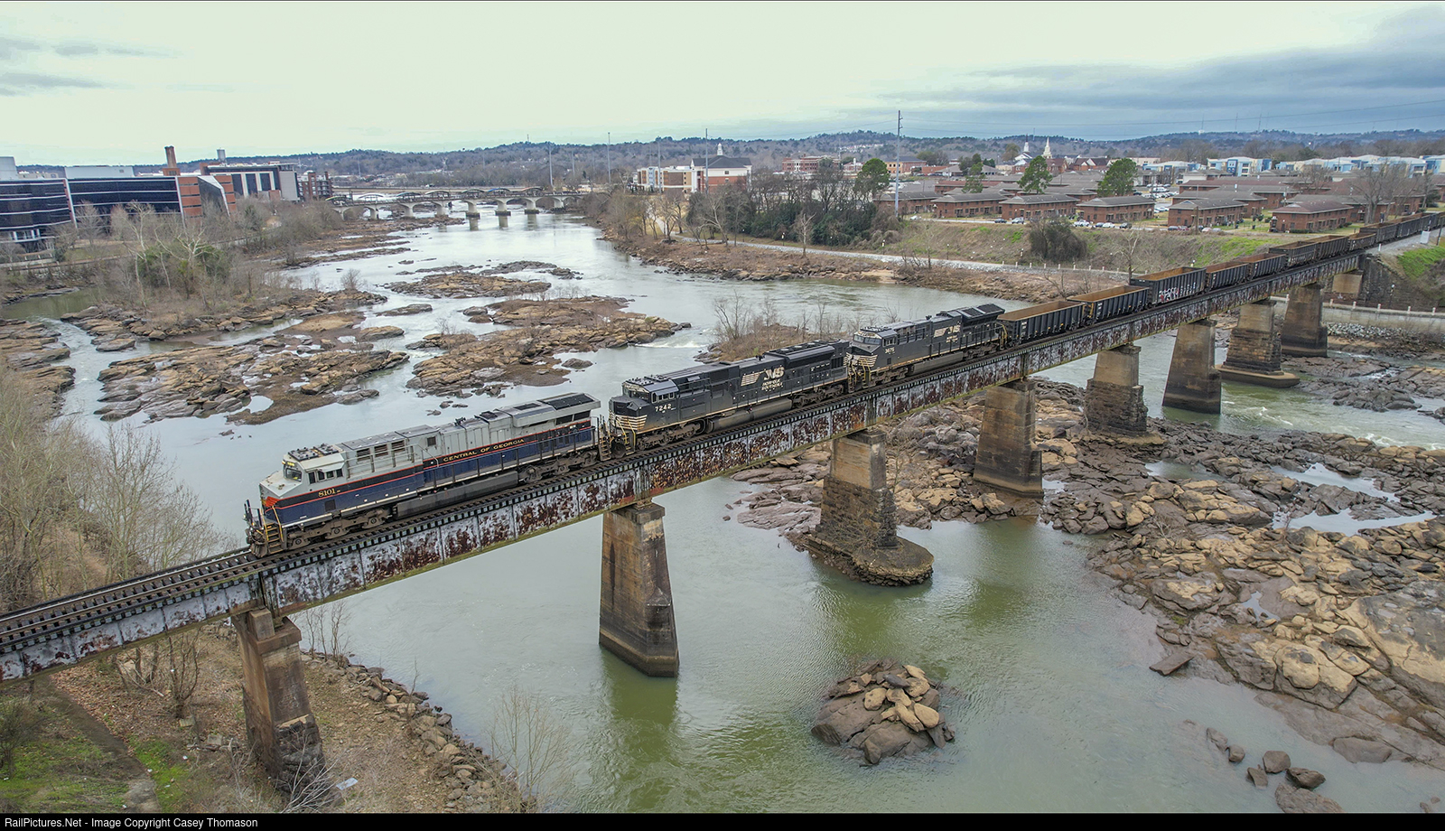 NS train 378 crosses the Chattahoochee River, out of Alabama, and into Columbus, Georgia, with the Central of Georgia heritage unit operating on "home rails".