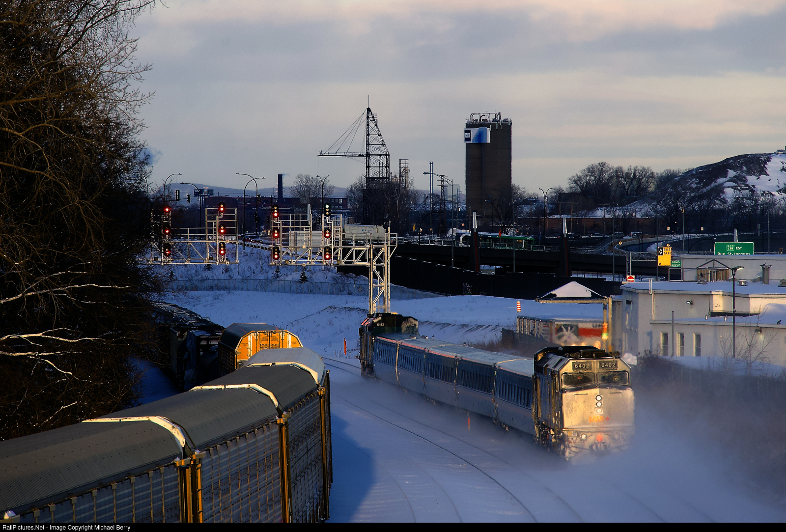 | VIA 64 is about to knock down a clear signal on the frigid afternoon after a big snowstorm hit Montreal. VIA 6412 is leading and wrapped VIA 6402 brings up the rear. At left is CN 372, changing crews nearby at Turcot Ouest. |