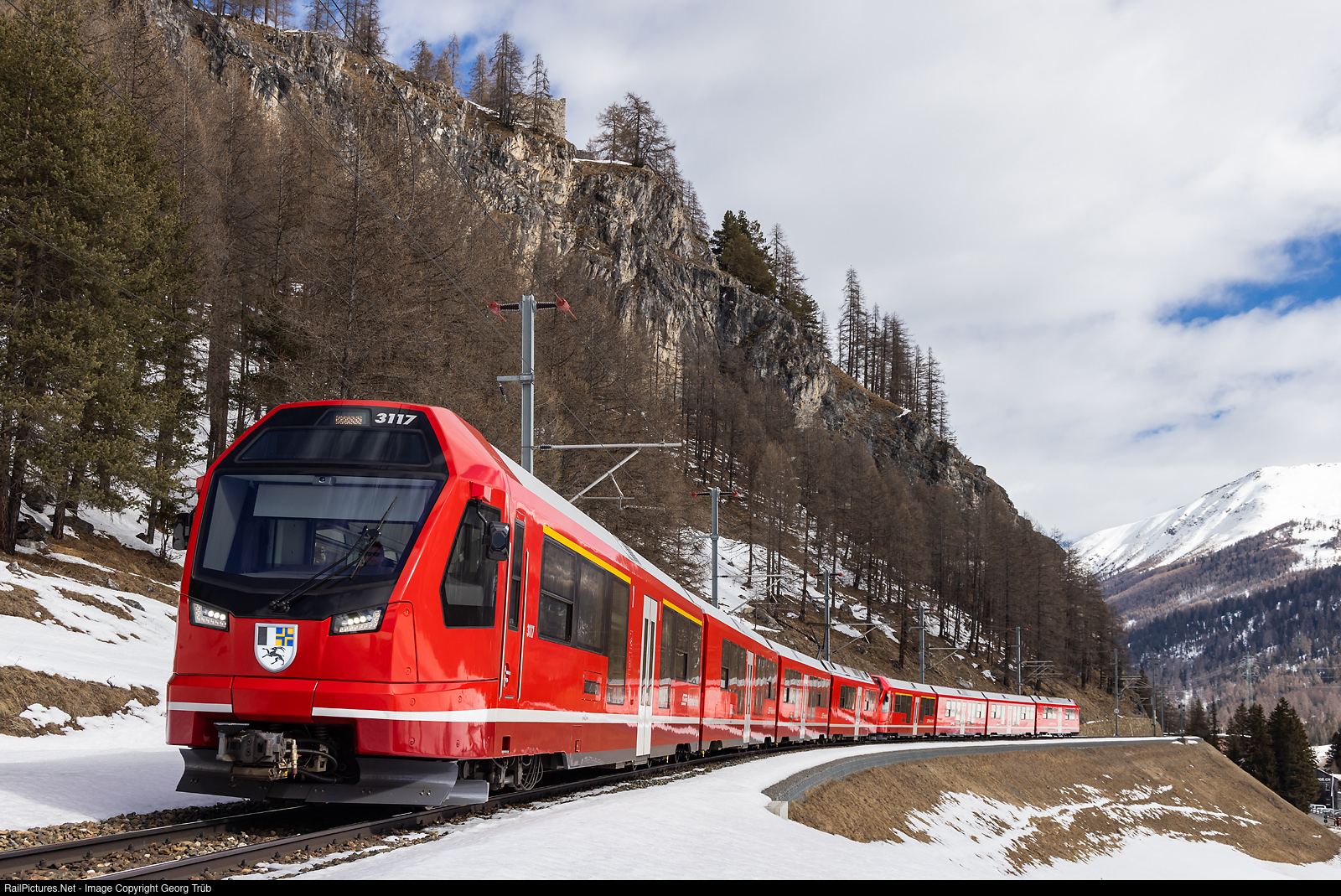 | "Capricorn" train ABe 4/16 # 3117 and # 3119 of the Rhaetian Railway in multiple control are running the Regio Express 1031 from Landquart via Klosters-Zernez to St.Moritz, between Madulain and La Punt Chamues-ch. On the mountain the ruins of Guardaval fortress from the 13th century. |