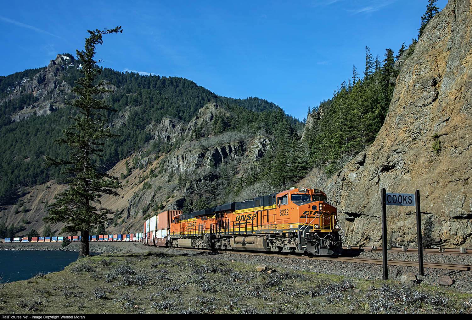 | An eastbound stack train on BNSF's Fallbridge Subdivision rolls through the siding at Cooks. It will get to wait for two westbounds before continuing its journey east along the Columbia River Gorge. |