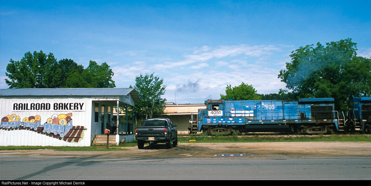 On a hot summer morning, MDS 4051 is slowly making its way south from Meridian to Waynesboro, MS. The enthusiastic employees of the Railroad Bakery have come out onto the porch and shouted their loudest while waving the crew down to come in for breakfast, which isn't a hard thing to do for a couple of railroaders who've made an 0500 start.
