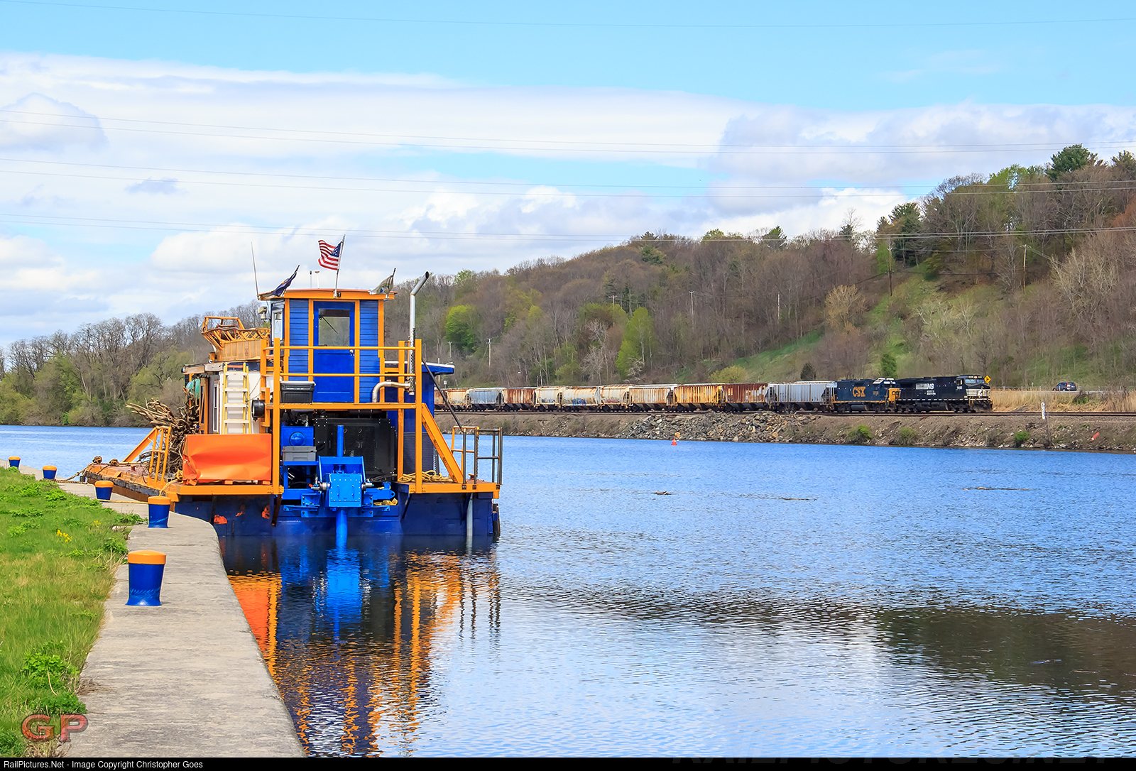 | Thinking of spring, CSX westbound manifest with NS 9682 & CSX 2729 pulling, glides through CP-173 passed Erie Canal Lock 10 area with a NYS Barge full of tree branches being used for spring clean up on the Mohawk River. |