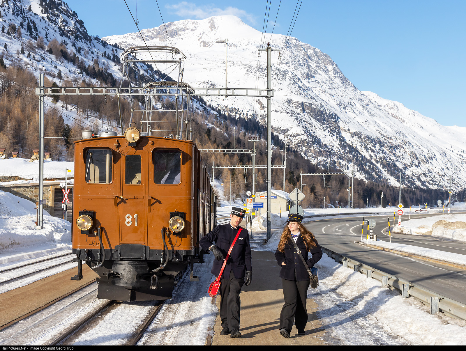 Ge 4/4 # 81 (or BB # 81) of the Blonay-Chamby Railroad Museum, built in 1916 for the Bernina Railway as Ge 2x3/3 # 81, as guest on the former home rails, is standing in Bernina Suot with a R.M. photo charter train, with contemporary train staff....