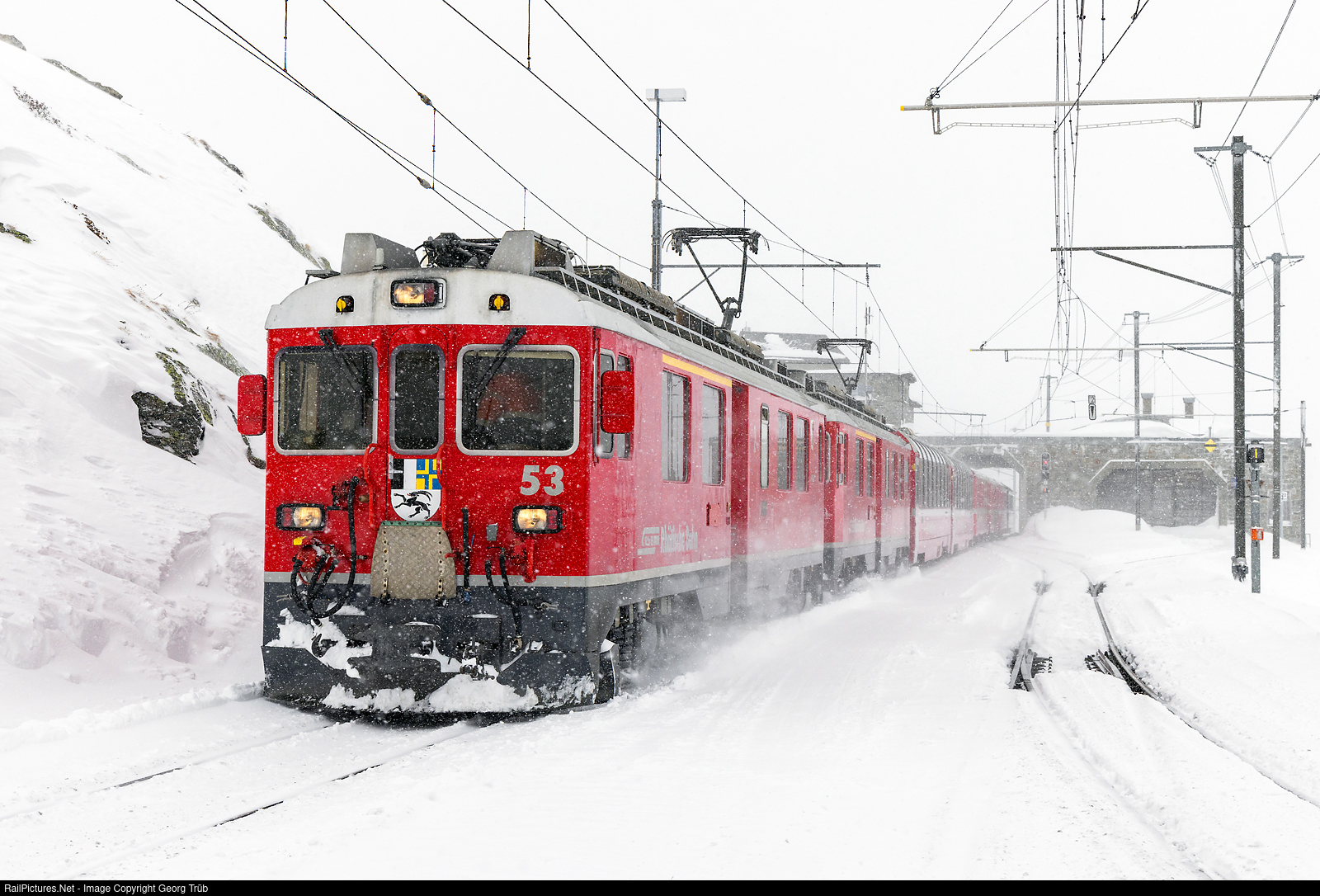 | Railcars ABe 4/4 # 53 and # 55 of the Rhaetian Railway in multiple control are entering Ospizio Bernina station with regional train 1636 from Tirano to St.Moritz. |