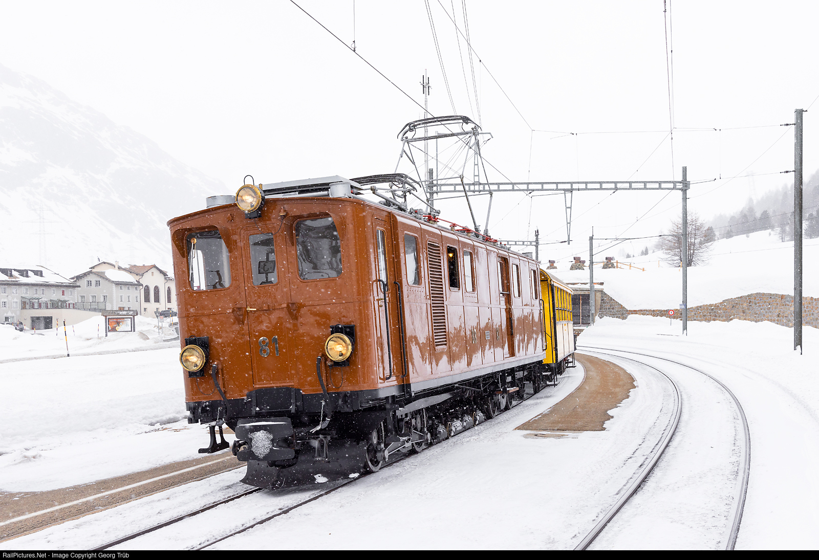 Ge 4/4 # 81 (or "BB 81") of the Blonay-Chamby Railroad Museum, built in 1916 by SLM and BBC for the Bernina Railway as Ge 2x3/3 # 81, as guest on the Bernina line for about one year, is standing in Bernina Suot with a R.M. photo charter train.