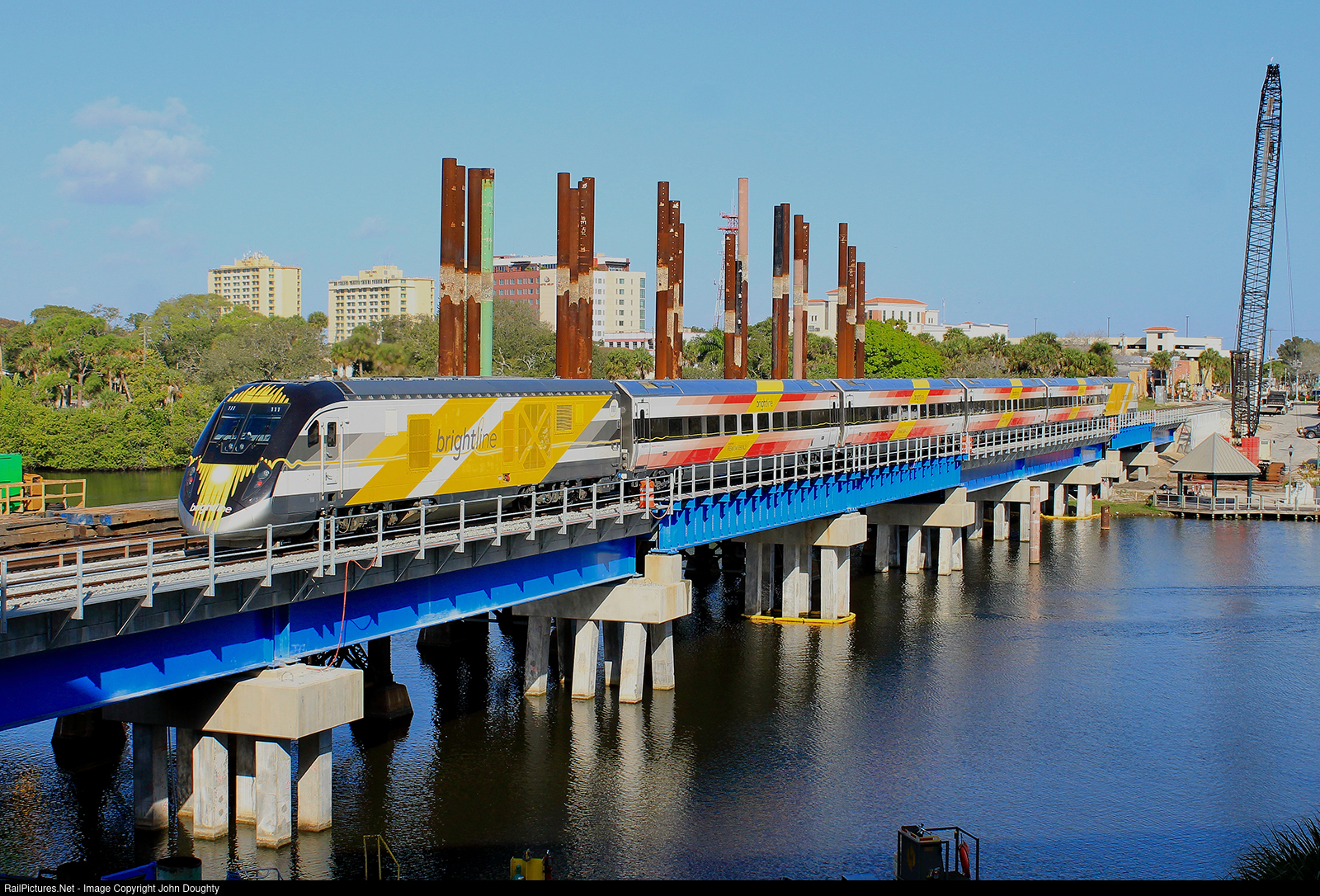A Brightline passenger train uses, for the first time, the new bridge across the Crane Creek in downtown Melbourne. This train is being used to qualify crews to run on the FEC. Traffic has now been diverted from the old FEC bridge on the left to the new bridge, allowing crews to begin removing the rails from the old bridge. Soon the old bridge will be removed and construction will begin on the second new bridge. All of this is for the new Brightline high speed passenger service between Miami and Orlando. |
