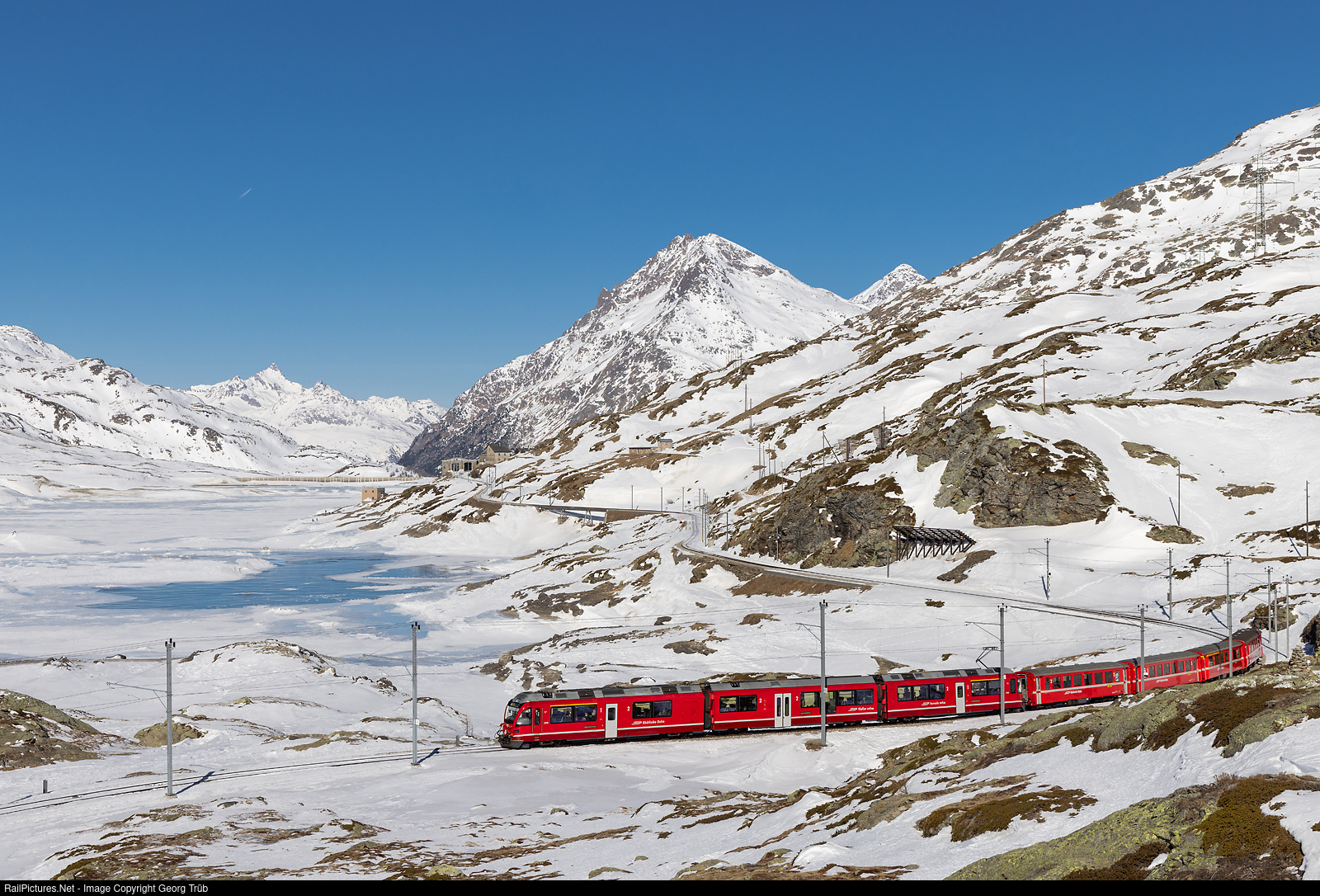 | "Allegra" ABe 8/12 # 3508 of the Rhaetian Railway is pulling regional train 4621 from St.Moritz to Tirano along the frozen Lago Bianco, between Ospizio Bernina and Alp Grüm. The dammed lake is lowered to the maximum for electricity production by RePower. In the background are from left in the far background Piz Ot north of the Engadine, and 3166 meter high Piz Albris and 3261 meter Piz Languard. |