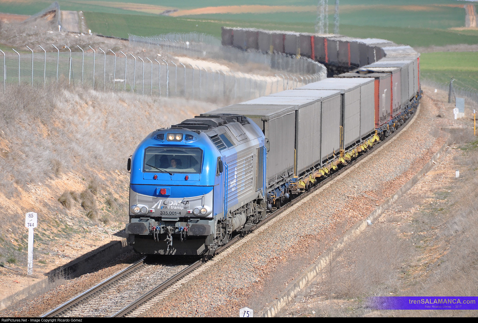 | La Euro4000 335-001 de COMSA en las inmediaciones de Salamanca remolcando un tren con Plataformas cargadas de cajas móviles.