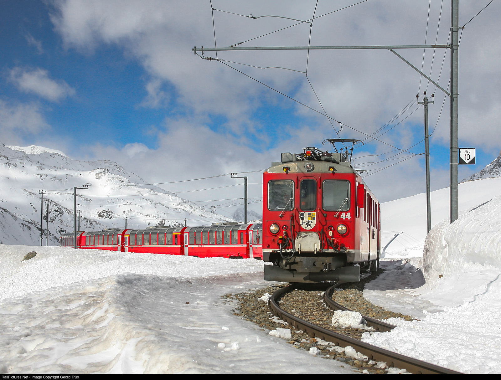 | Railcars ABe 4/4 # 44 (and not visible # 43) are pulling the train 953 BERNINA EXPRESS from Chur to Tirano, on the Bernina pass between Bernina Lagalb and Ospizio Bernina. This railcars are in charge between Pontresina and Tirano. Both railcars were scrapped in 2010. |