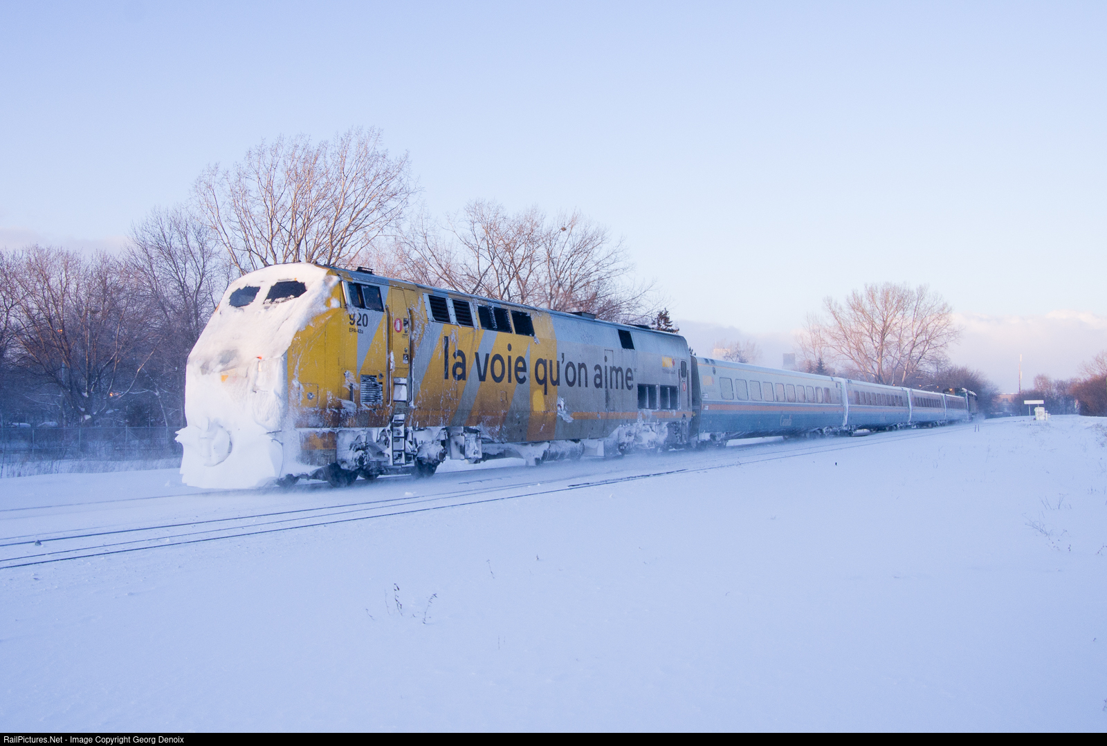 | VIA 920 with its nose covered in thick snow brings up the rear of VIA 64 from Toronto, running almost on time despite the heavy snow fall during that day. |