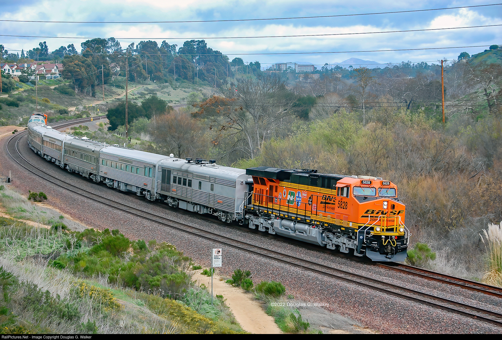 BNSF Railway Officer Special O-SDGSDG9-22 is returning to San Diego after a run to Oceanside earlier in the morning. This train, passing through Rose Canyon as it descends Miramar Hill, has a pair of 25th Anniversary engines, one on each end – BNSF ES44AC 5828 up front, and ES44AC 6017 on the rear, with 7 cars from the Railway’s business car fleet: Power car 51 Mt Rainier, business car 63 Glorieta Pass, business car 6 Topeka, sleeping car 67 Trinchera Pass, business car 4 Missouri River, dining car 10 Lake Superior and full-length dome/lounge 31 Carl R Ice. (San Diego, California – February 22, 2022)