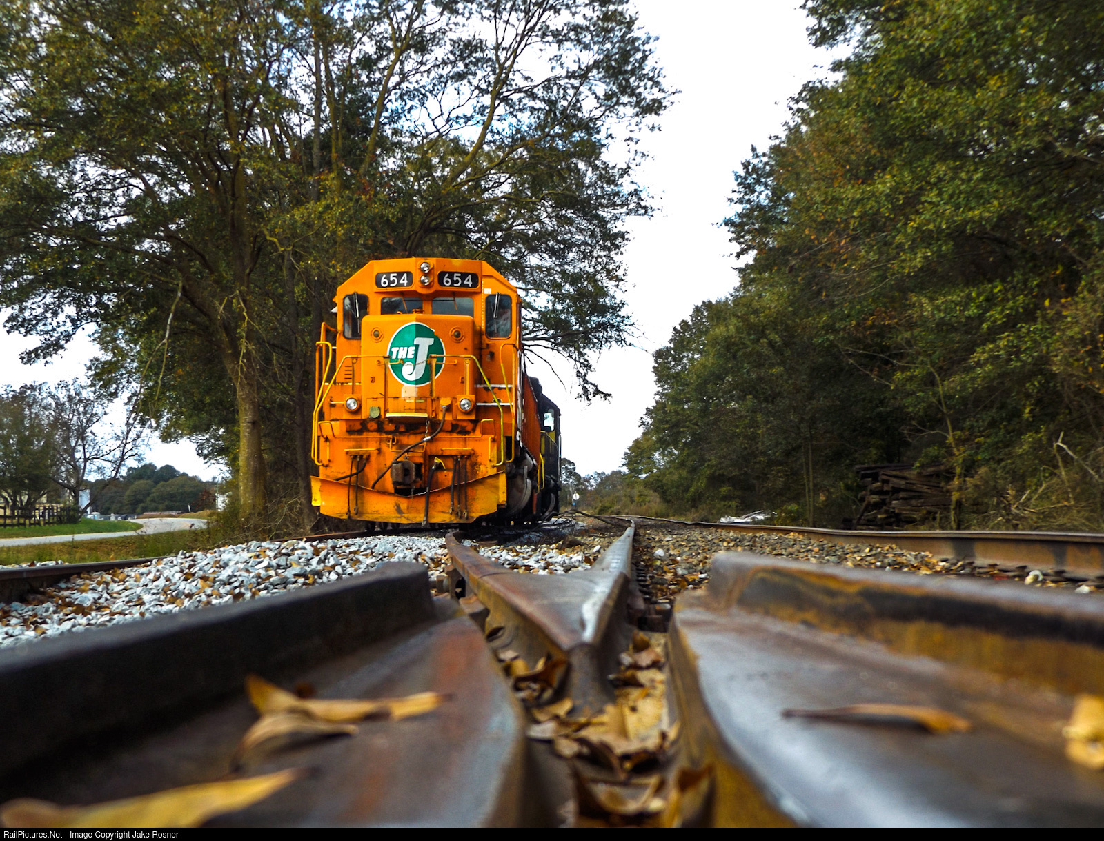 | HRT 654, still wearing it's bright orange paint, sits in a siding in Bowersville, waiting for the new week to start so it can be put back to work. |