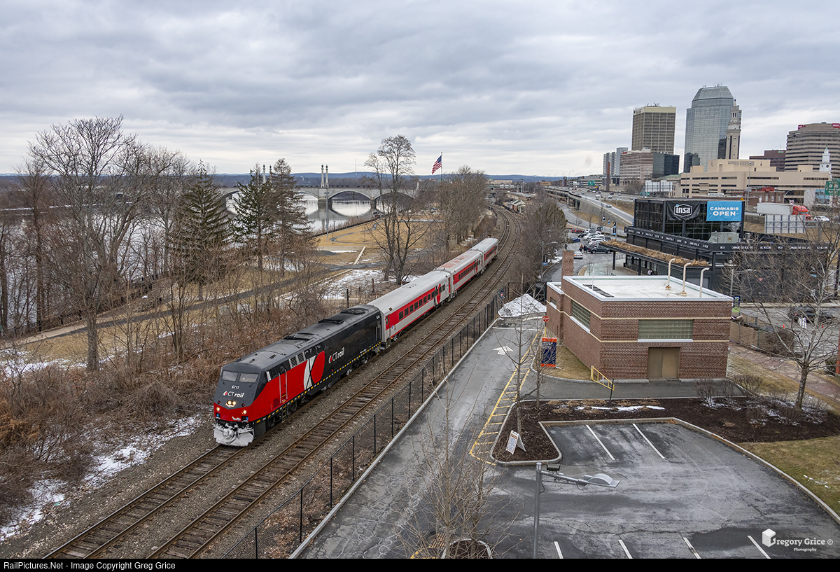 CTrail Hartford Line train 6455 departs the city of Springfield, Massachusetts on evening of February 12th, 2022.