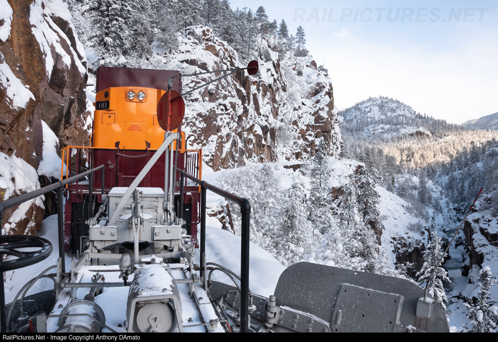 After several days of heavy snow, ex White Pass & Yukon #101 leads the Durango & Silverton flanger train into the Animas Canyon, where it will tackle progressively deeper snow on its way to Cascade Canyon.