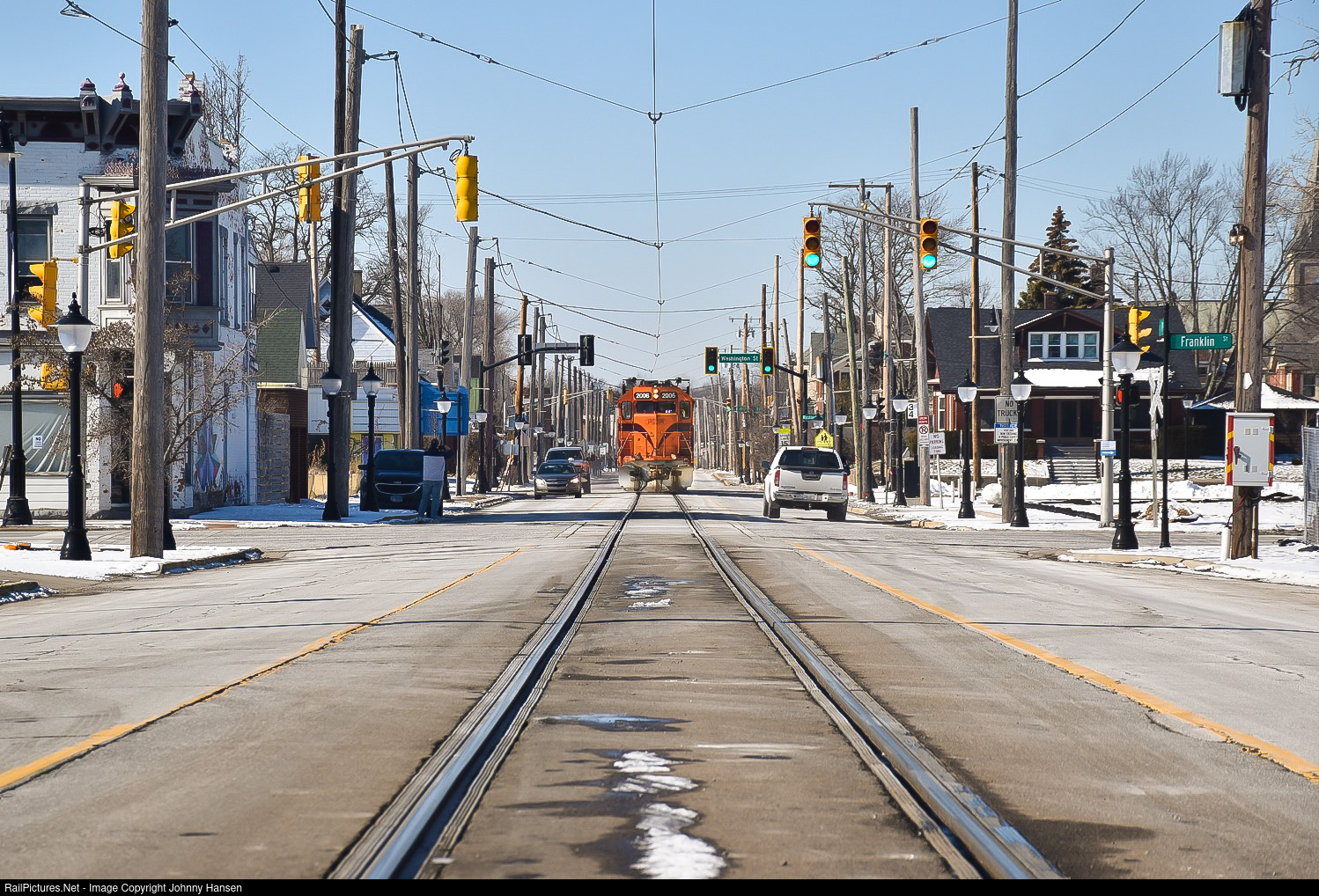 It’s the end of the line for the majority of street running for South Shore Line trains in Michigan City. Beginning February 28, 2022, construction will begin. Eventually, the road will be converted to one way, and the tracks off to the side. Buses will replace commuter trains between the Carroll Avenue (Michigan City) and Porter as part of the project to double-track the CSS mainline between Gary and Michigan City. Here we see CSS 2008 leading CSS 2006 trailing heading light power toward Bailey through the center of 11th St, heading through the intersection at Washington St.