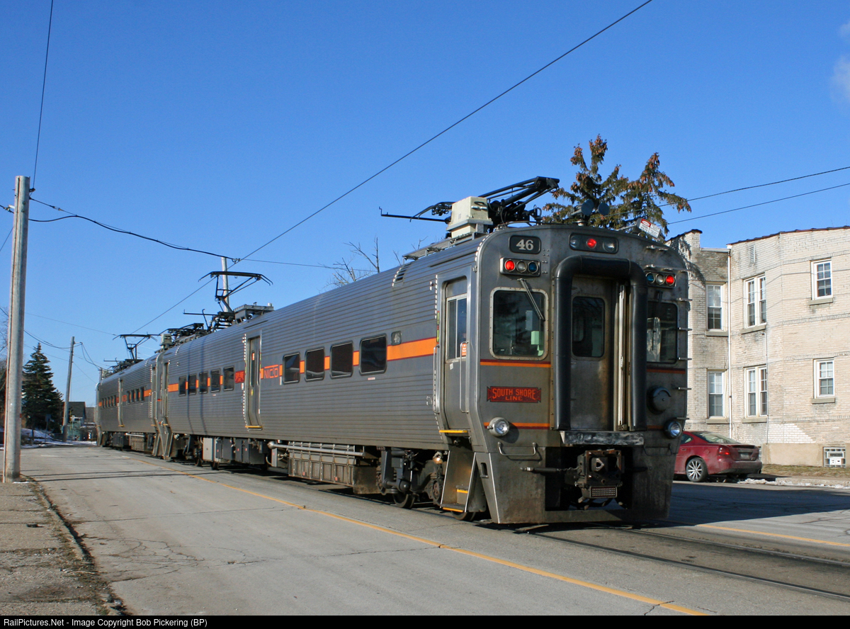 A South Shore express service rolls through the streets. The tracks now are doubled and lay to the right in their own right of way ending street running here.