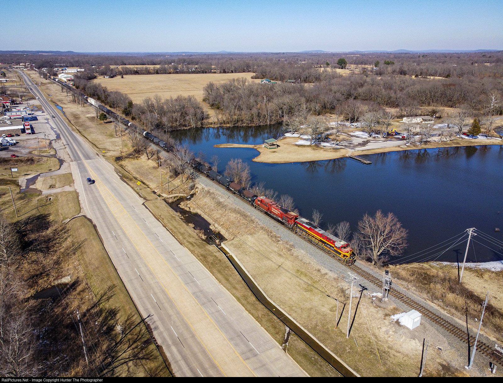 Southbound manifest train MKCSH rolls by the small lake at Adair Park in Stilwell, OK on a warm February 27, 2022.