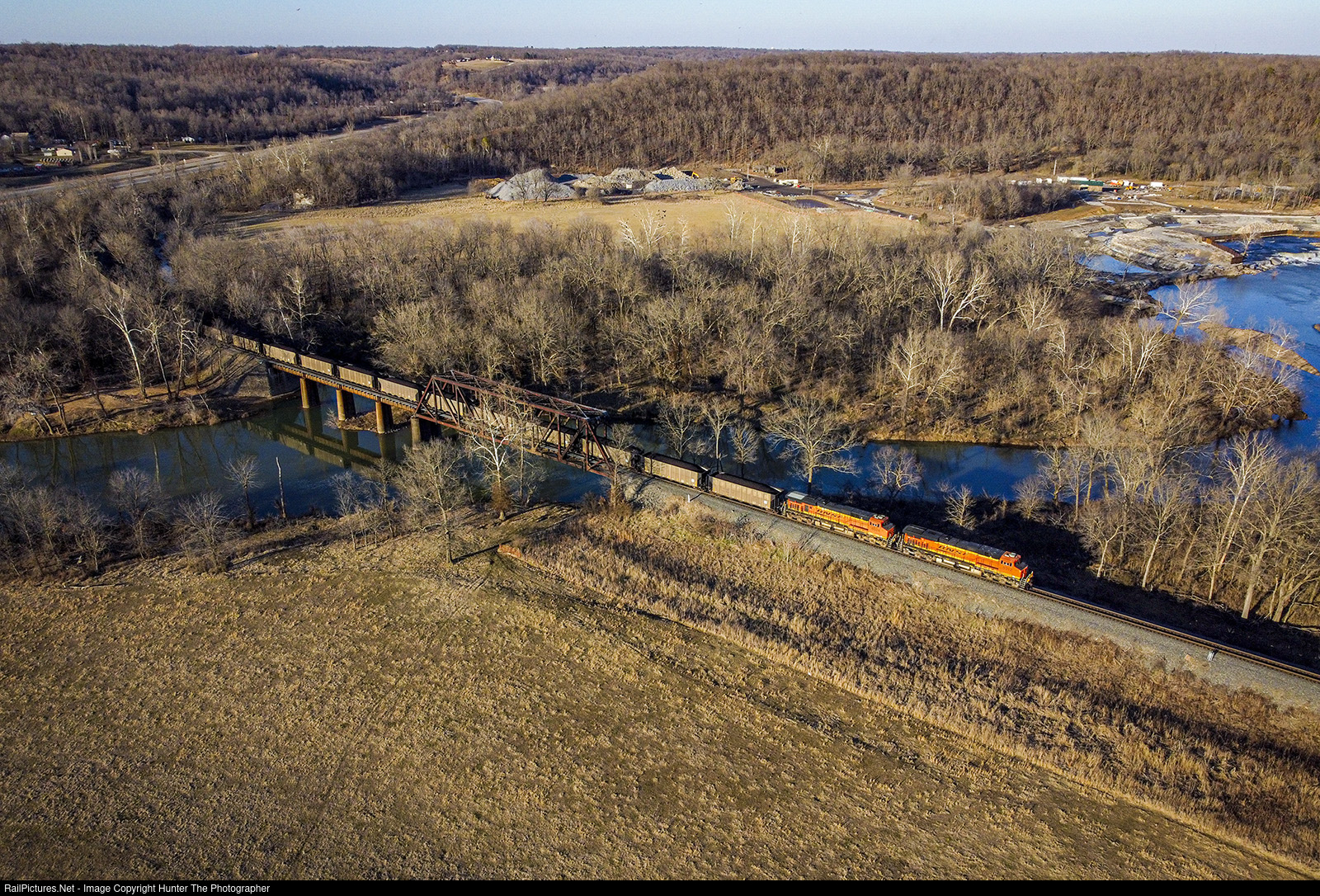 | A BNSF coal train heads south across a bridge just north of Watts, OK late in the day on February 27, 2022. |
