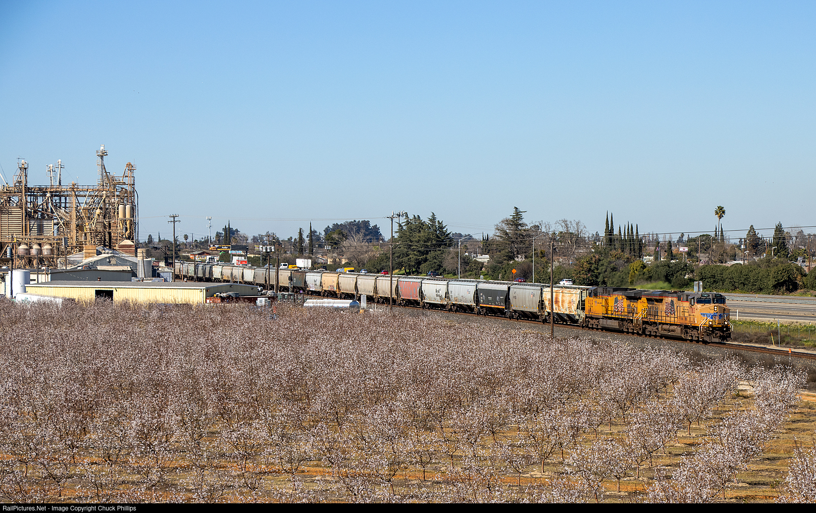 A Union Pacific potash train passes by A.L. Gilbert Company Livestock Feed Plant in Keyes Ca.