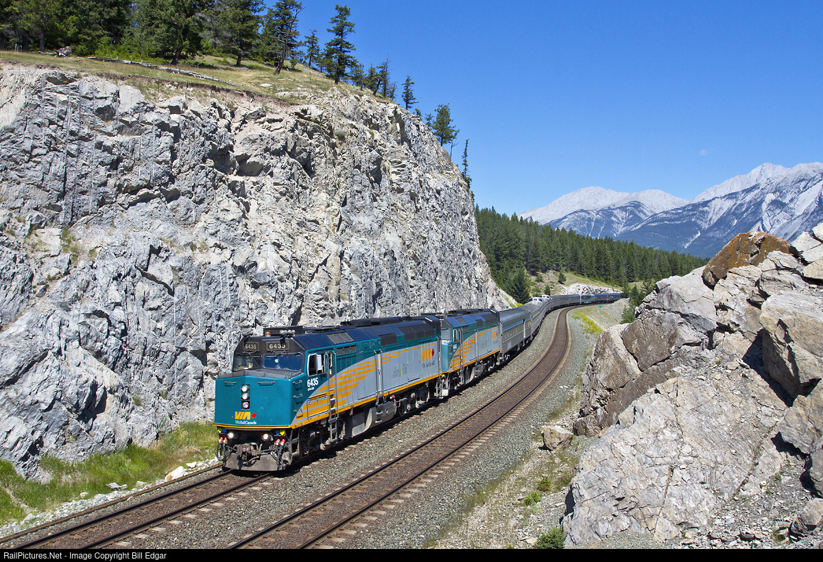 | VIA 6435 leads the westbound "Canadian" through a cut at English just prior to its arrival at Jasper, AB. Passengers will have some time to tour the village before continuing west to Vancouver or changing trains to the "Skeena" to reach Prince George and Prince Rupert. |