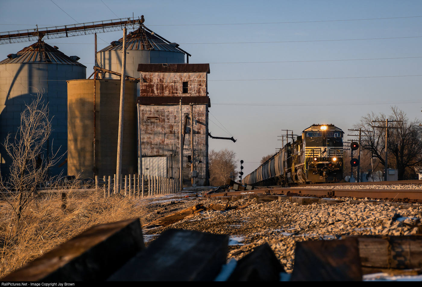 With the sun quickly approaching the horizon, an NS unit grain cruises through Lodge, passing both the old elevator & historic searchlight signal, that make this tiny town so well known.