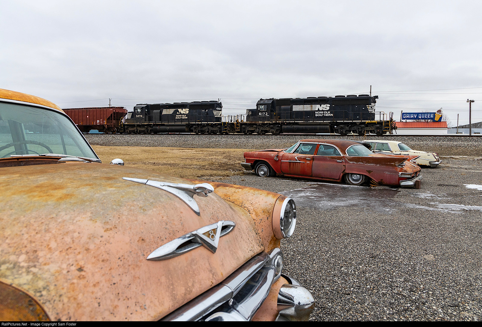 Norfolk Southern D36 passes an assortment of old vehicles as it accelerates out of Gibson City, Illinois. An old Dairy Queen sign completes the scene. Leading the train is a former Norfolk & Western SD40-2, which is still set up to lead long hood forward.
