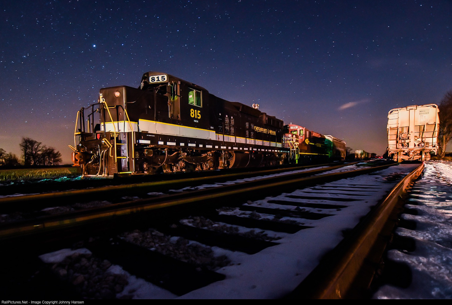 IBCX 815 and 813 take a rest in Thomaston under the starry night.