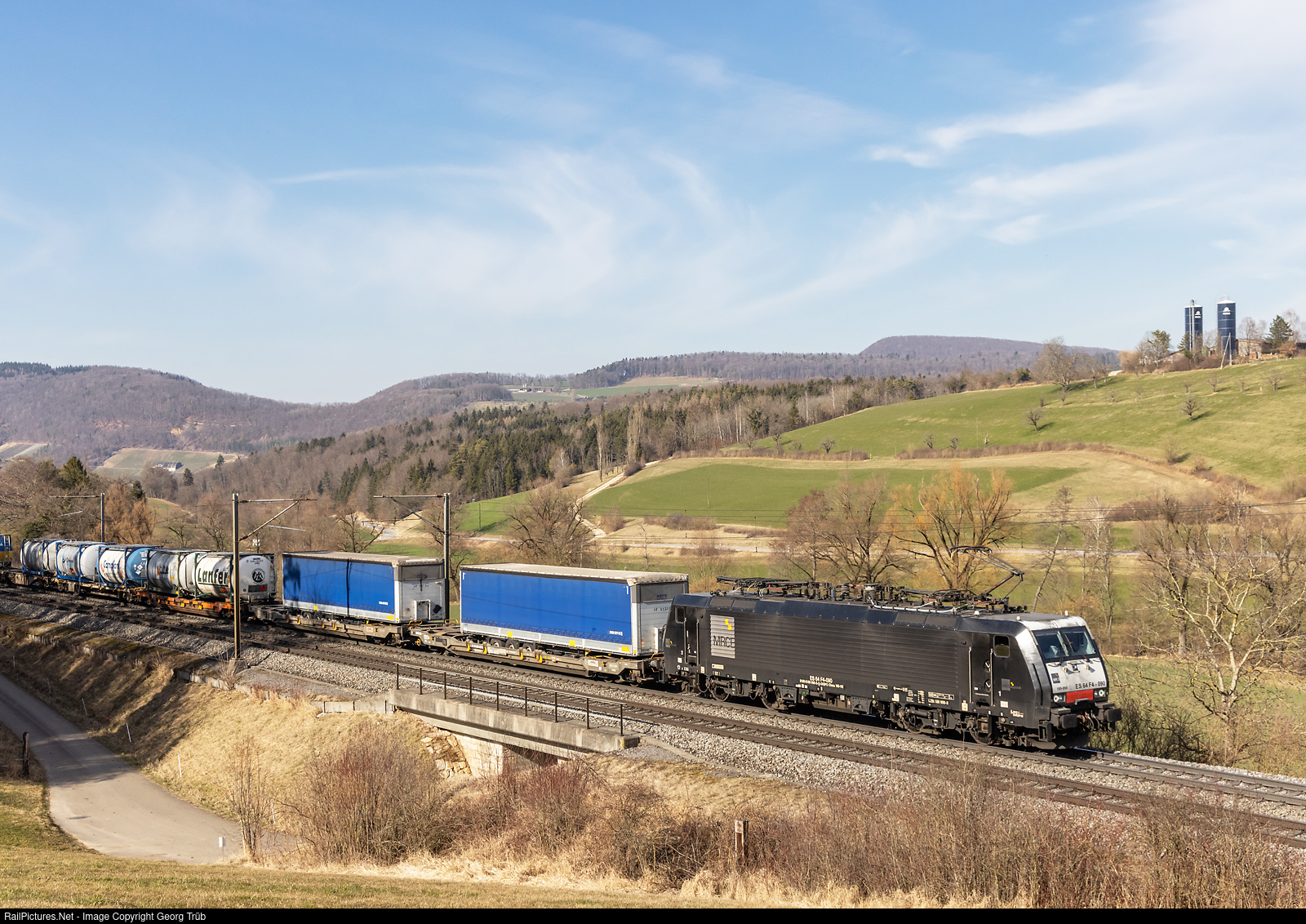 | "MRCE Dispolok" Siemens Eurosprinter ES64 F4 # 090 (or 189 # 990), rented to SBB Cargo International, is pulling the southbound Hupac intermodal train 40245 from Antwerpen-D. S. Oorderen/Belgium via Basel-GBT-Luino to Gallarate/Italy (Busto Arsizio Terminal), on the Bözberg north ramp between Hornussen and Effingen. |