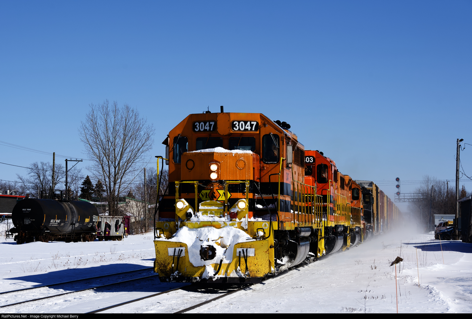 | SLR 393 has left the Sherbrooke Sub and is now on the St-Hyacinthe Sub as it approaches St-Hyacinthe Station with four EMDs (SLR 3047, RLHH 3043, SLR 3007 & QGRy 6904) and 42 cars. |