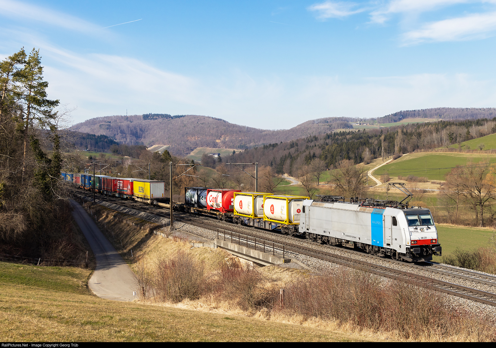 | Bombardier TRAXX F140 MS 186 # 251 of Railpool, rented to TXLogistik, is pulling the southbound TXL intermodal train 41033 from Duisburg-Ruhrort Hafen Ubf via Basel-Gotthard Base Tunnel-Ceneri Base Tunnel-Chiasso to Milano SM, on the Bözberg north ramp between Hornussen and Effingen. |