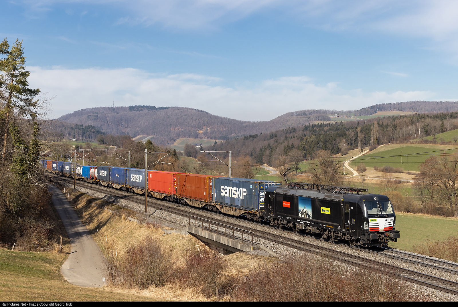 | Siemens "Vectron" MS 193 # 713 (or X4E-713) of MRCE Dispolok, rented to BLS Cargo, is pulling the southbound intermodal train 40233 from Rotterdam Waalhavn via Basel-Gotthard Base Tunnel-Ceneri Base Tunnel-Chiasso to Melzo Scalo, on the Bözberg north ramp between Hornussen and Effingen. |