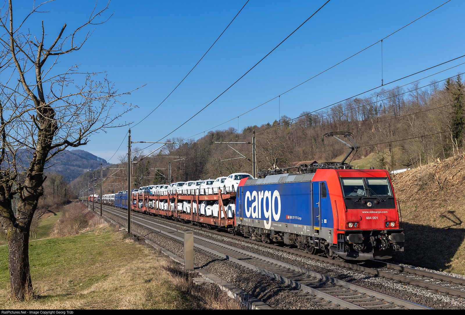 | Bombardier TRAXX F140 MS Re 484 # 001 of SBB Cargo is pulling the train 47017 from Basel to Lupfig, transporting new VW cars, on the Bözberg south ramp between Schinznach Dorf and Brugg VL. |