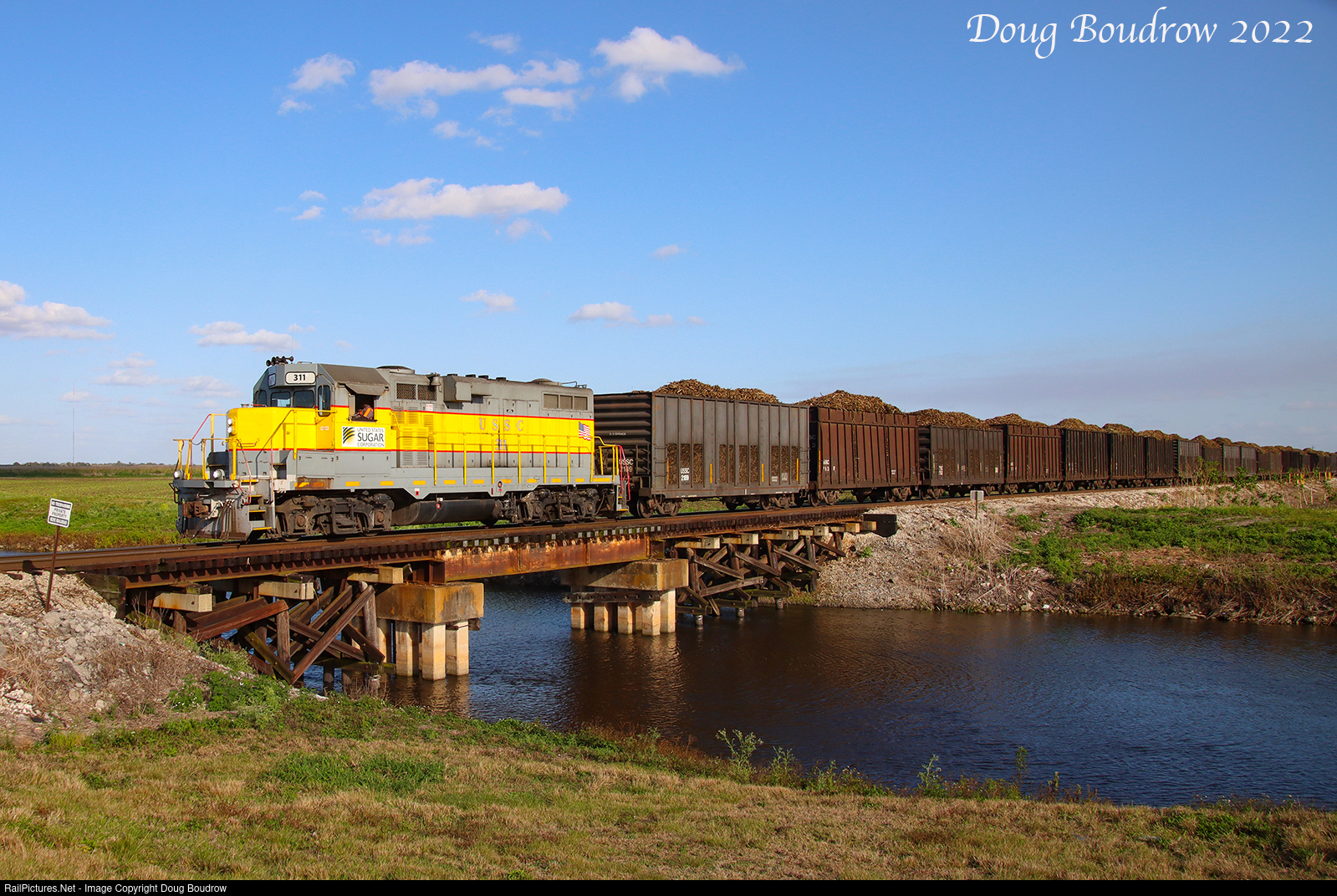 United States Sugar Corporation 311 is seen leading a train from the cane fields back to the mill In Clewiston. The train is crossing the Miami Canal at Lake Harbor. The GP11 locomotive was built as a GP9 for the Illinois Central in January of 1957 as IC 9214. The Miami Canal drains Lake Okeechobee all the way down to the coast at Miami, hydrating dozens of sugar fields along the way.
