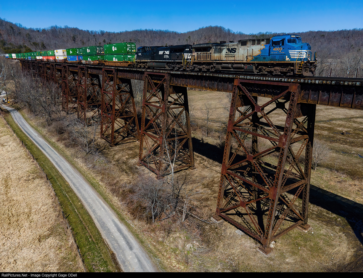 | After refueling and swapping crews at Danville, NS 229 makes a beeline for Chattanooga as it crosses the Green River Trestle at South Fork on the CNO&TP behind one of the sonic bonnets |