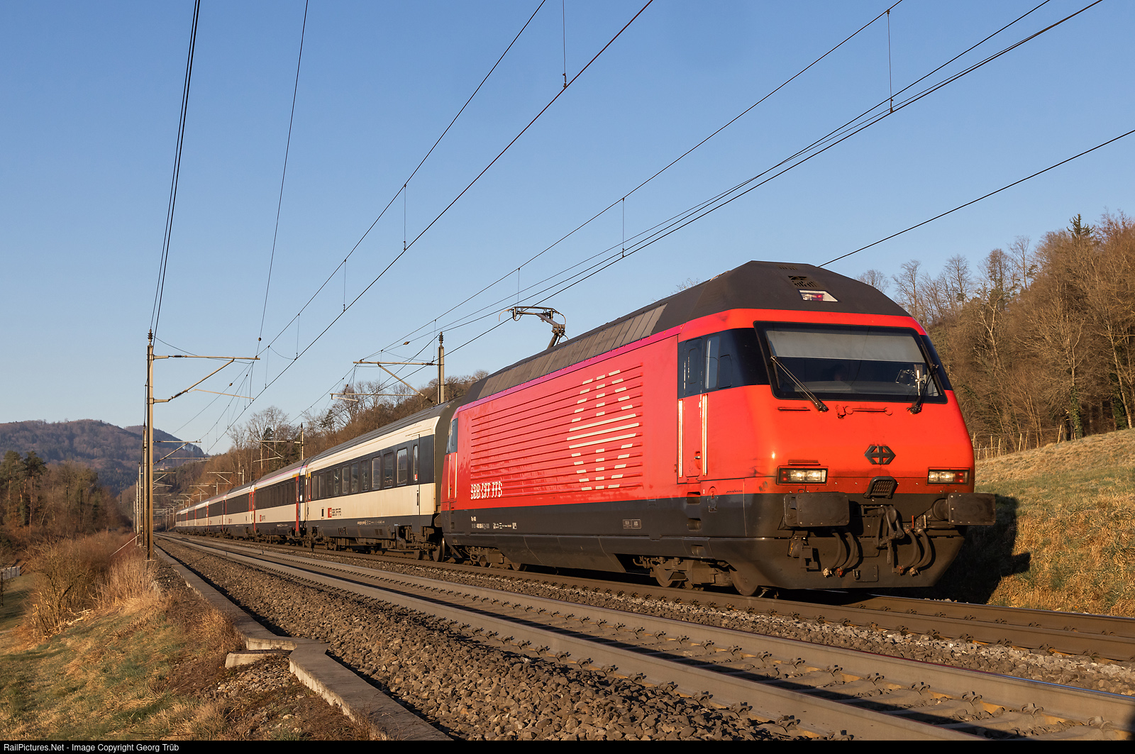 | Re 460 # 080 of the SBB is pulling Interregio 1961 of the line IR 36 Basel-Brugg-Zürich, on the Bözberg south ramp between Schinznach Dorf and Brugg AG. This is a push-pull train with standard cars of type IV. |