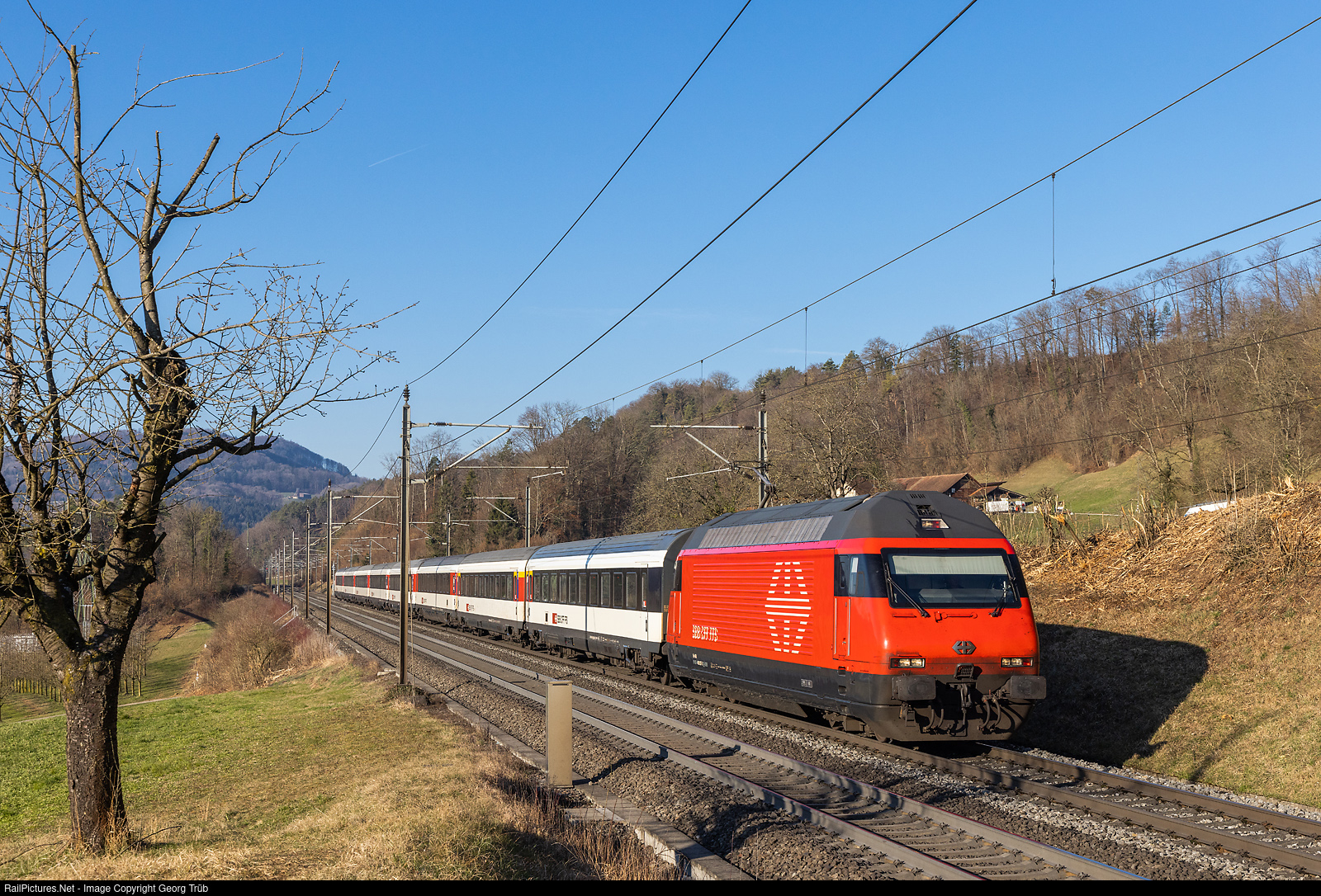 | Re 460 # 037 of the SBB is pulling Interregio 1963 of the line IR 36 Basel-Brugg-Zürich, on the Bözberg south ramp between Schinznach Dorf and Brugg AG. This is a push-pull train with standard cars of type IV. |