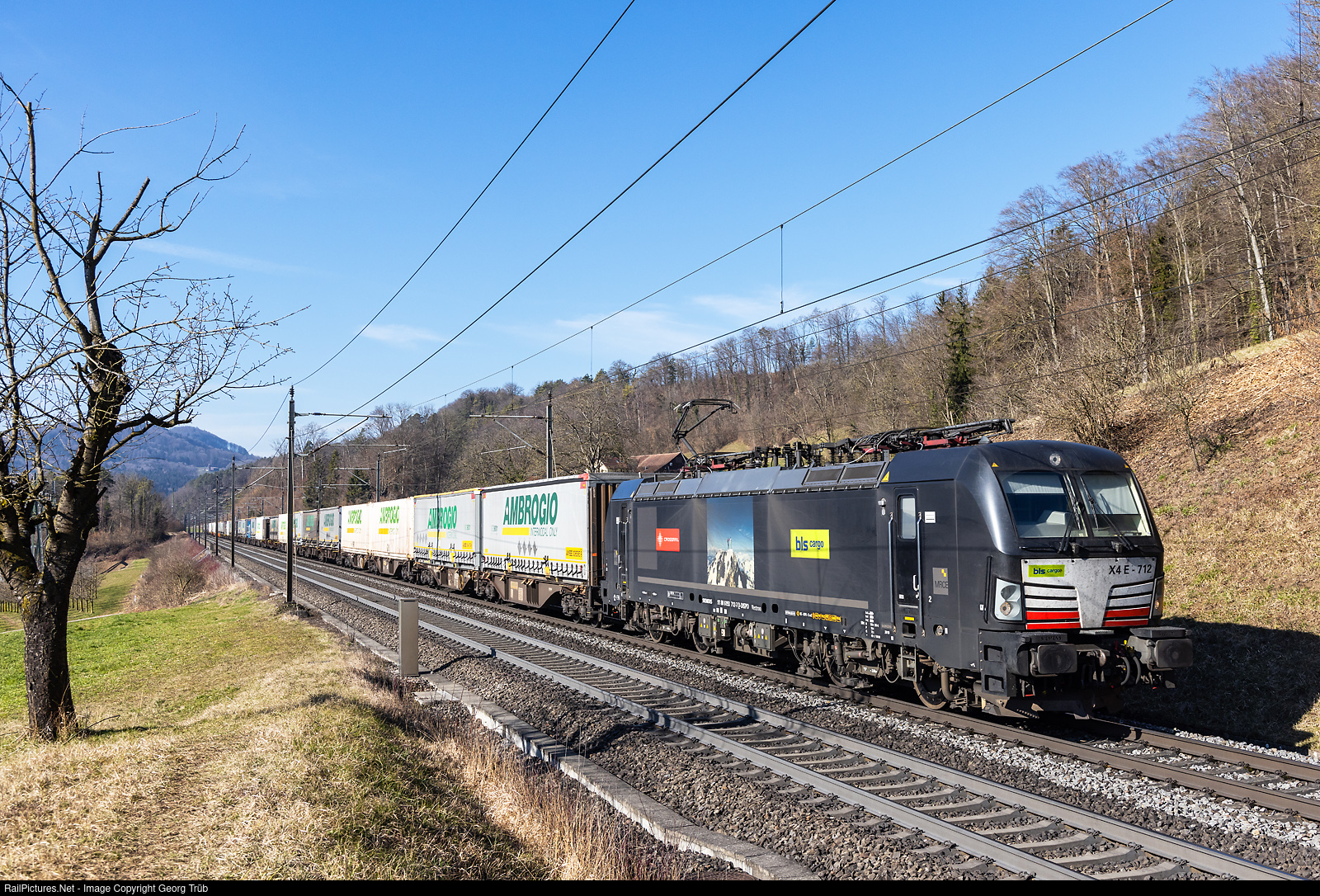 Siemens "Vectron" 193 # 712 (or X4E-7129 of Siemens Dispolok, rented to BLS Cargo, is pulling the Ambrogio intermodal train 42031 from Neuss Hessentor via Basel-GBT-Luino to Gallarate (Busto Arsizio Terminal), on the Bözberg south ramp between Scinznach Dorf and Brugg VL.