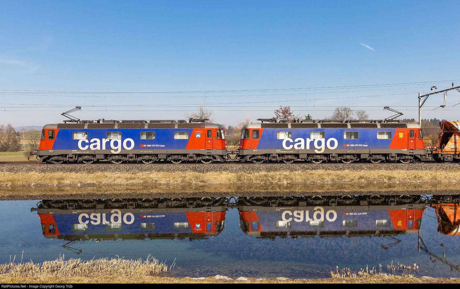 Around 21000 HP for an empty train. Re 620 # 071 (Re 6/6 # 11671) "Othmarsingen" and Re 620 # 082 (Re 6/6 # 11682) "Pfäffikon SZ" (with blazon, but without name) of the SBB in multiple control are pulling the empty gravel train 67554 from St.Gallen Haggen via St.Gallen-Romanshorn-Winterthur-Bülach to Hüntwangen-Wil, along the pond at Riedt between Erlen and Sulgen.
