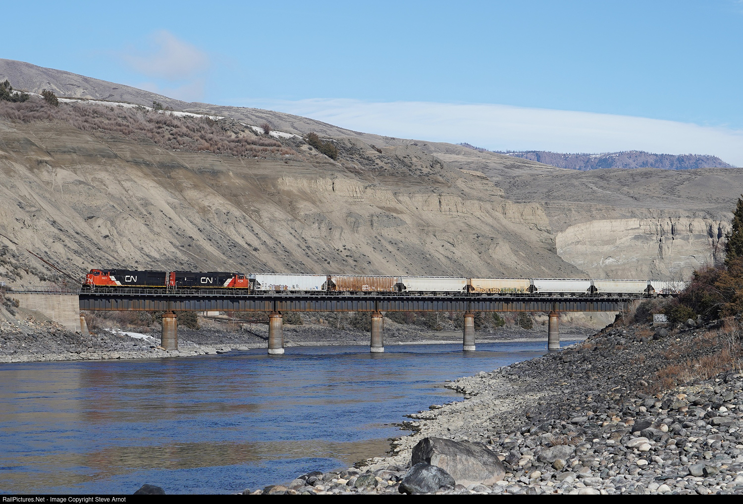 SD70I 5611 and SD75I 5708 cross over the Thompson River as they arrive at Ashcroft with CN 599.