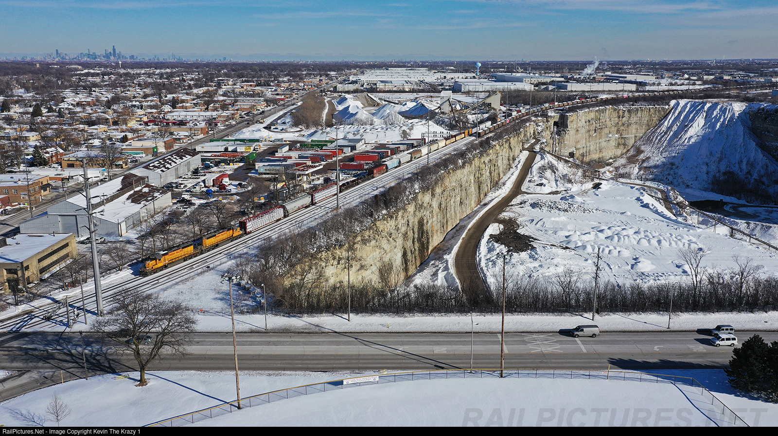 A UP transfer from CN's Glenn Yard to Proviso passes the Vulcan Materials quarry in McCook on IHB's main line.
