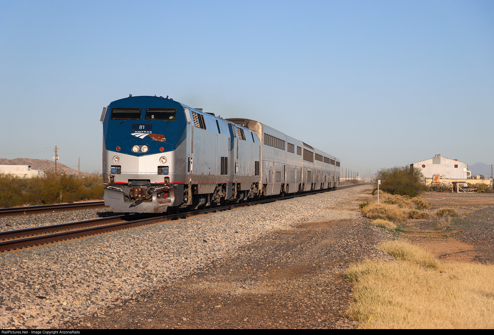 | Amtrak's eastbound Sunset Limited rolls into Eloy on a cool February morning, running a little over an hour late. |