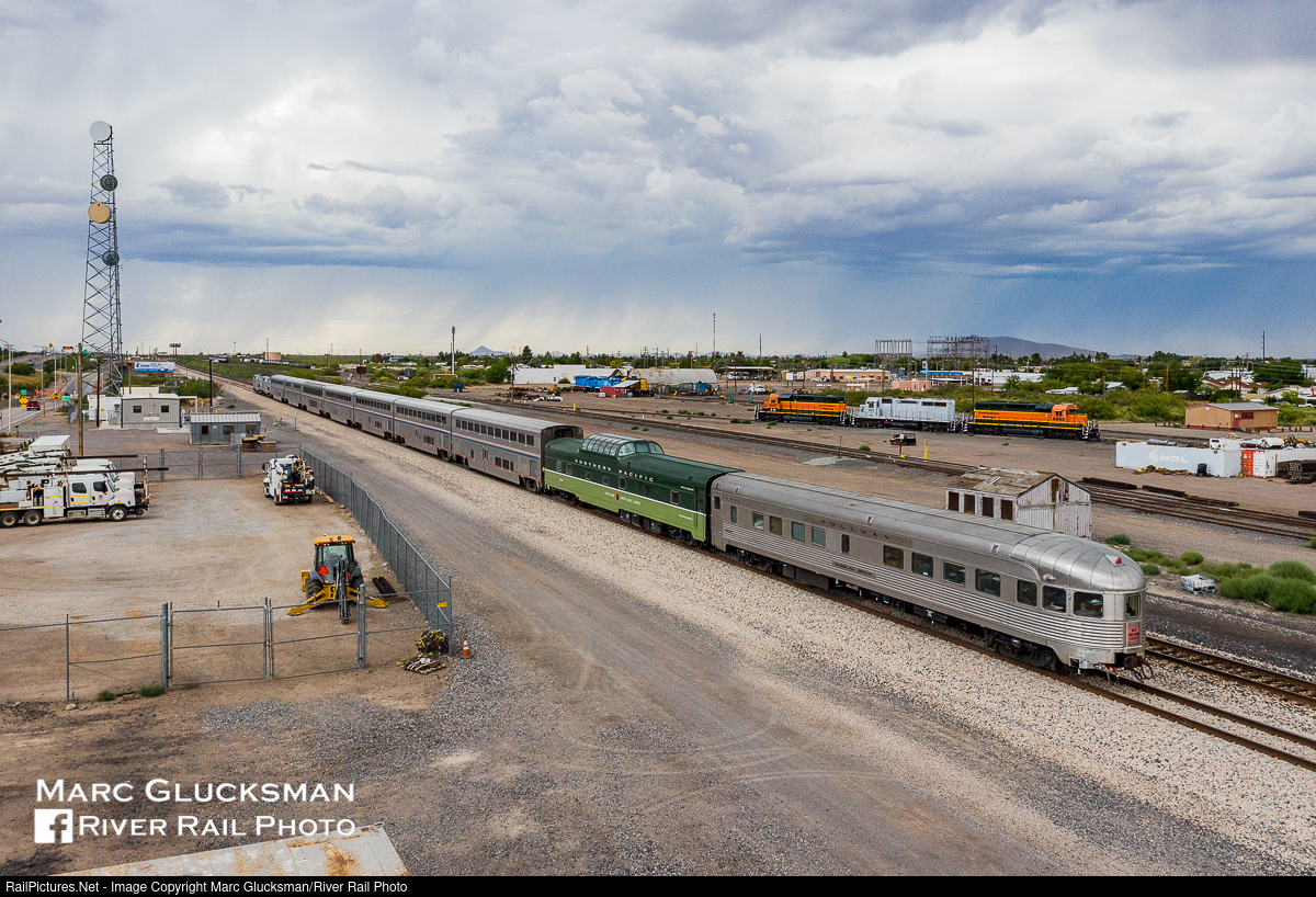 Storm Looming. While it is still sunny in the foreground, the horizon has a frightening tinge in Deming, New Mexico on July 19, 2020. Just before the rain started, Webb Rail's former New York Central Railroad Budd built Pullman obs/diner/sleeper "Babbling Brook" (WEBX 800007) and former Northern Pacific Railway Budd built Pullman dome/sleeper 313 (WEBX 801044) departed Deming station while holding the markers for Amtrak Train 1 (Sunset Limited). In the background sit engines of the Southwestern Railroad, some showing their recent BNSF heritage.