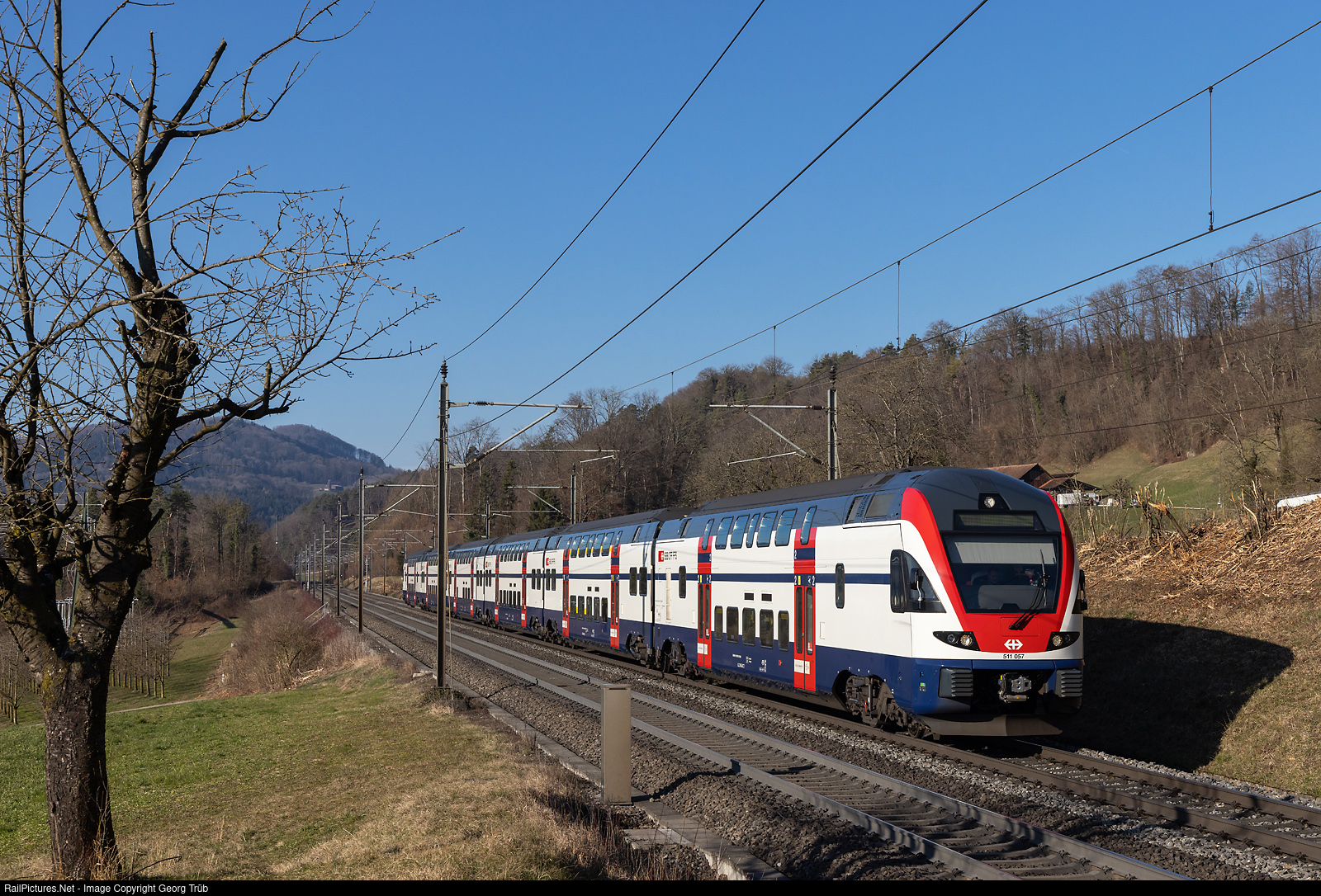 | Doubledeck commuter train RABe 511 # 057 of the SBB is running light from Basel SBB to Oberwinterthur service center on the Bözberg south ramp between Schinznach Dorf and Brugg AG. |