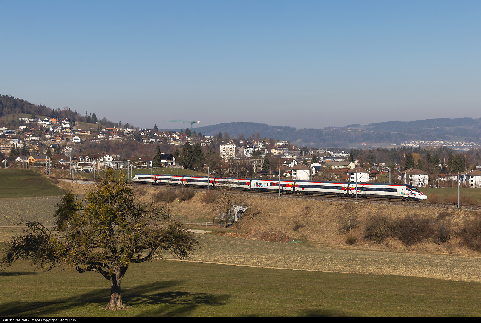 Highspeed tilting train "Astoro" RABe 503 # 018 of the SBB is running as Eurocity 99 from Zürich via St.Gallen-Bregenz-Lindau Reutin to Munich, between Uzwil and Flawil. This train has a publicity paint scheme with the name of "München" on both end cars and "Zürich" on the restaurant car, for the new 3,5 hours service between this two cities. The train RABe 503 # 018 had a head-on collision with an Ee 922 shunting locomotive in Zürich on december 26th, 2021, and is now repaired in service again.