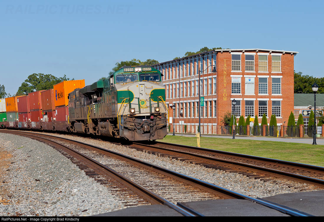 | The Southern RR Heritage Unit passes the Tannery Row Office Complex, a former leather tannery. 8099 was damaged less than 3 months later when it hit a rock slide in Pittsburgh while leading intermodal train 20W. I should have chased it into Atlanta, but in life the rear view mirror is always clearer than the windshield. |