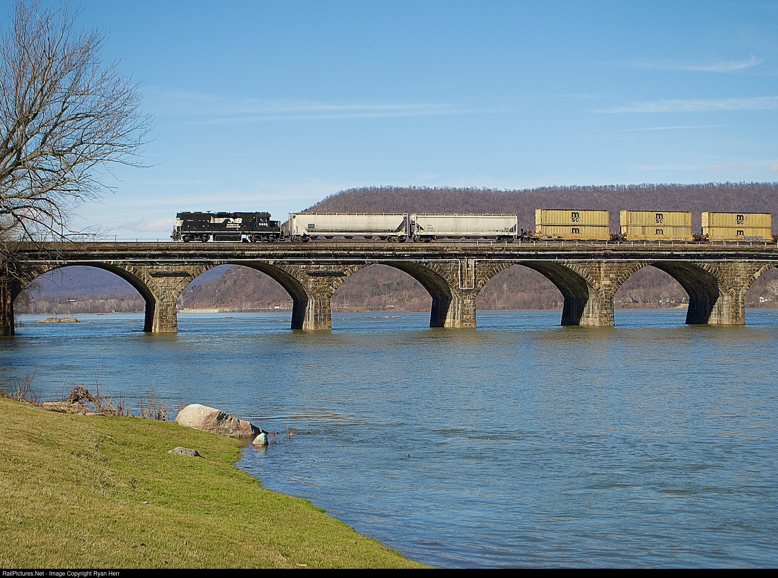 Running long hood forward, NS 5666 leads a local train over the Susquehanna river and into Enola yard.